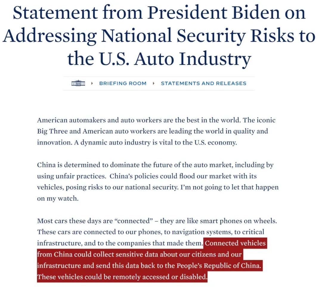 還表示咱們的智能網聯汽車會在運行的時候收集美國的基建信息,然後傳回中國。
