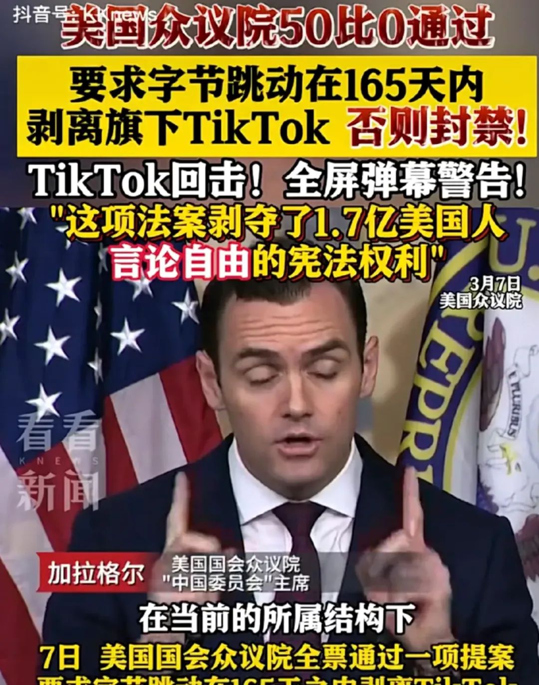 美國國會眾議院能源和商務委員會表要求中國字節跳動公司剝離對旗下短視頻應用程序TikTok的控制權,否則TikTok就會在美國遭到封禁。目前tiktok只能孤注一擲——給全美的tiktok用户“彈窗”,號召大家起來反抗美國國會的“暴政”……