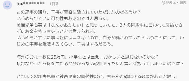 正如這篇報道所説,孩子真的只是被騙了嗎?我覺得有可能是受到了霸凌。受害兒童其實也覺得“哪裏有點奇怪”,但是被3個同學説了,因為無法反駁就只能付錢了。在學校被欺負的事情很難對父母説出口,所以就當成是自己被騙了,隱瞞了被欺負的事實,想來這是孩子會做的事吧。一張海外的紙幣25萬日元。就算是小學生,應該也會覺得價格不合理很奇怪吧?因為害怕,不知道不付錢對方會對自己做什麼,所以不敢拒絕,乖乖付了錢了吧?我覺得有必要好好確認下受害者和加害者們之間真實的關係。