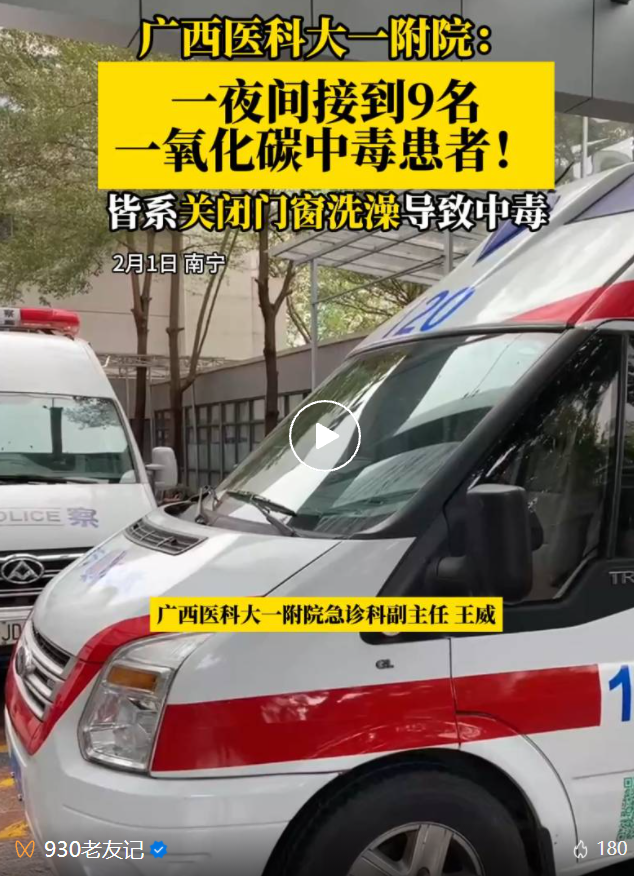 2024年2月1日,廣西醫科大學第一附屬醫院就連夜搶救了9名一氧化碳中毒患者,不幸的是,其中1人經醫護人員現場全力搶救無效死亡。