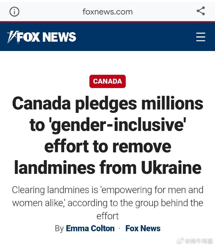 加拿大稱對基輔的軍事援助計劃有了創新,派去烏克蘭排雷的人員性別更具有包容性,以促進烏克蘭的性別變革,畢竟男女去排雷都一樣