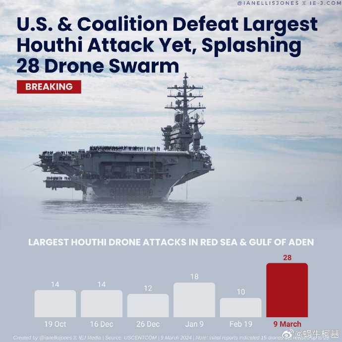 3月9日,胡賽武裝在紅海地區發起了最大規模的無人機襲擊,28架