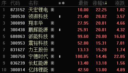 3月11日,電池板塊集體大漲,寧德時代盤中漲近15%。截至當日收盤,領湃科技(300530.SZ)、翔豐華(300890.SZ)、鵬輝能源(300438.SZ)收穫20CM漲停。