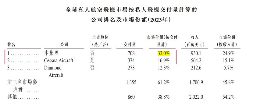 憑藉這些飛機,西鋭飛機在私人航空市場佔據了領先地位。根據弗若斯特沙利文的資料,西鋭飛機是全球私人航空市場中最大的私人飛機製造商,按交付飛機數量計,於2023年,西鋭飛機於全球私人航空市場的市場份額為32.0%,幾乎是第二名Cessna Aircraft的2倍。
