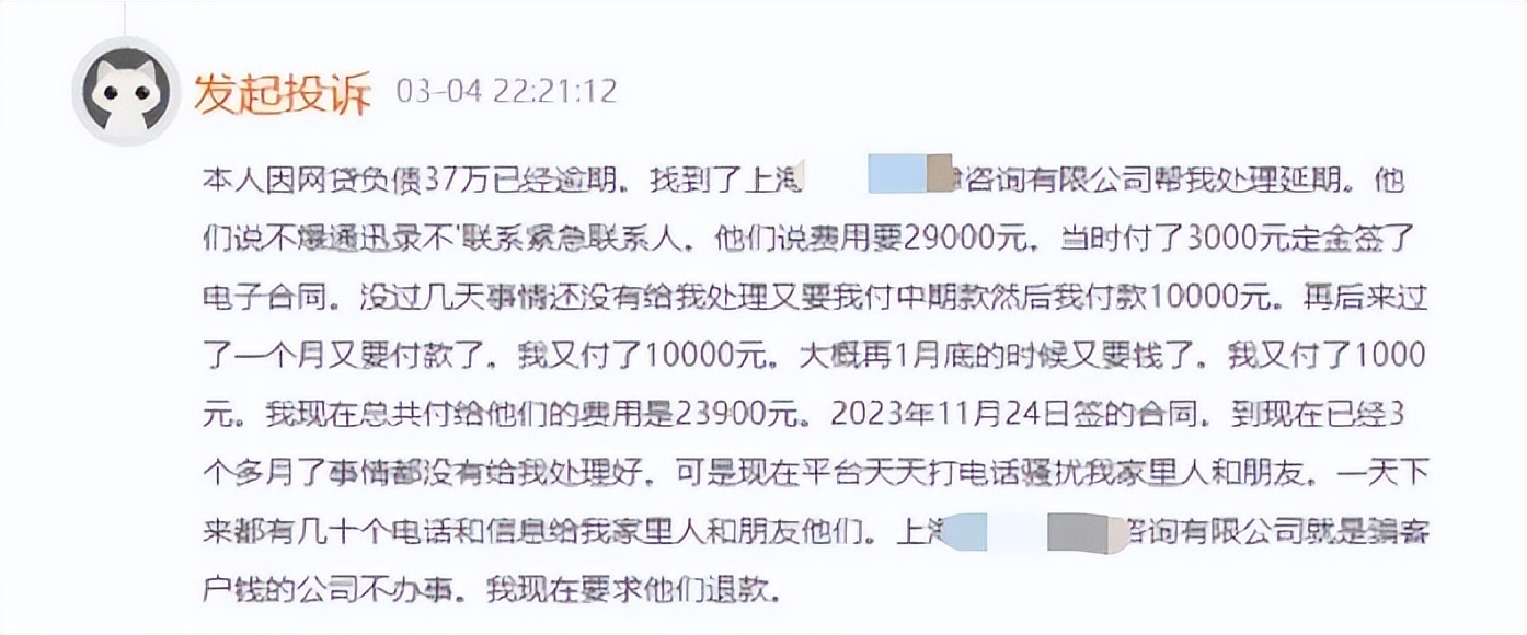 一投訴用户表示,其本人因網貸負債37萬且已逾期,找到該公司尋求幫忙延期,前後付了23900元的費用。但現在離去年11月底簽訂合同已經過去三個多月,仍沒有處理好,每天自己和家人朋友都會受到網貸公司的催收電話,且要求退服務費不成,發信息也不再回復。
