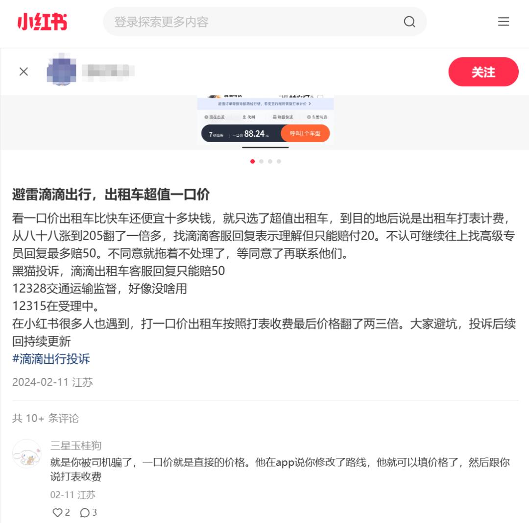 而在小紅書上,這樣打了一口價出租車,卻按照打表收費,導致最後價格翻了兩三倍的事情並不少見。