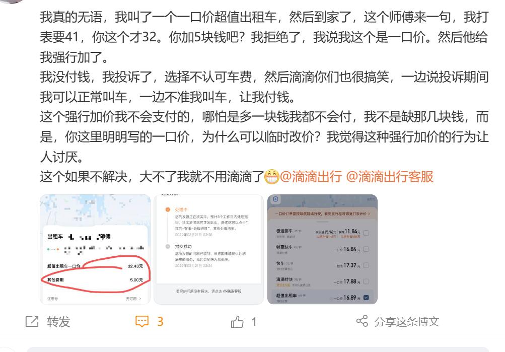 如果司機選擇了與導航不同的路線行駛,就可以不再按照平台給出的一口價進行結算,而是打表計價,還有乘客反映自己在打到“超值出租車”後,被司機以“打表不止這麼多錢”為由強行加價5元,乘客拒絕並投訴,最後的結果是不支付車費無法繼續使用滴滴叫車。