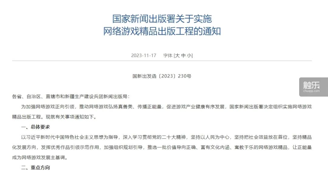 在觸樂去年的預測中,新的遊戲扶持計劃是非常重要的部分,因為這是政策方面比較直接的風向標。好消息是,2023年9月,國家新聞出版署宣佈實施“網絡遊戲精品出版工程”,並在11月正式下發通知。報名併成功入選的作品會獲得扶持。此前,較為知名的扶持政策有版署2004年開展的“中國民族網絡遊戲出版工程”與廣電總局2016年開展的“原創遊戲精品出版工程”,它們為上百部國產遊戲提供了支持。