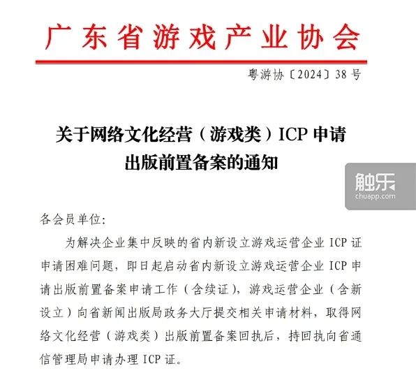 如3月5日,廣東省遊戲協會發布了《關於網絡文化經營(遊戲類)ICP申請出版前置備案的通知》。通知表示,針對省內新設立遊戲運營企業ICP證申請困難的問題,“即日起啓動省內新設立遊戲運營企業ICP申請出版前置備案申請工作(含續證),遊戲運營企業(含新設立)向省新聞出版局政務大廳提交相關申請材料,取得網絡文化經營(遊戲類)出版前置備案回執後,持回執向省通信管理局申請辦理ICP證。”