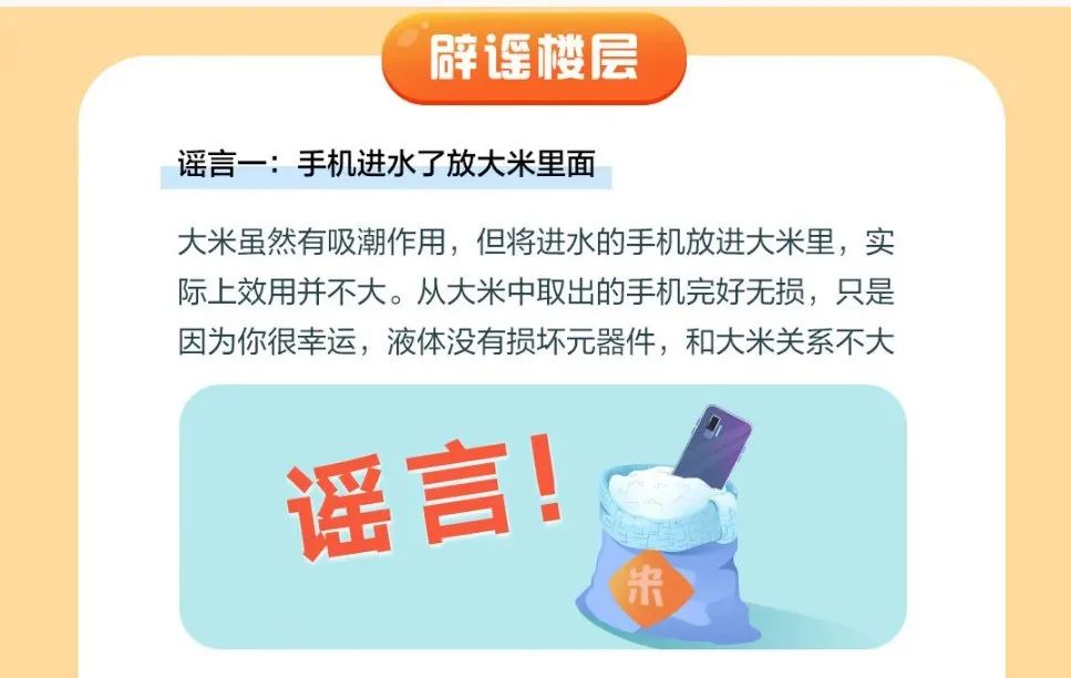 裏面也有手機進水後放進大米里的謠言澄清,直接指出這樣做的的實際效用並不大。