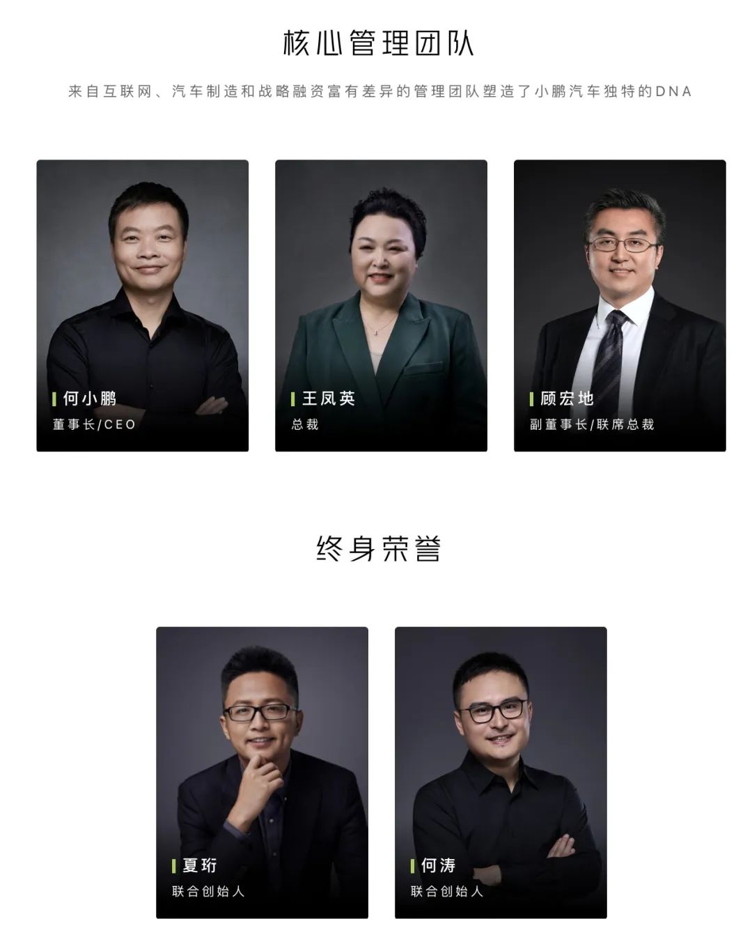 現在,小鵬汽車“核心團隊成員”為董事長/CEO何小鵬、總裁王鳳英和副董事長/聯席總裁顧宏地。