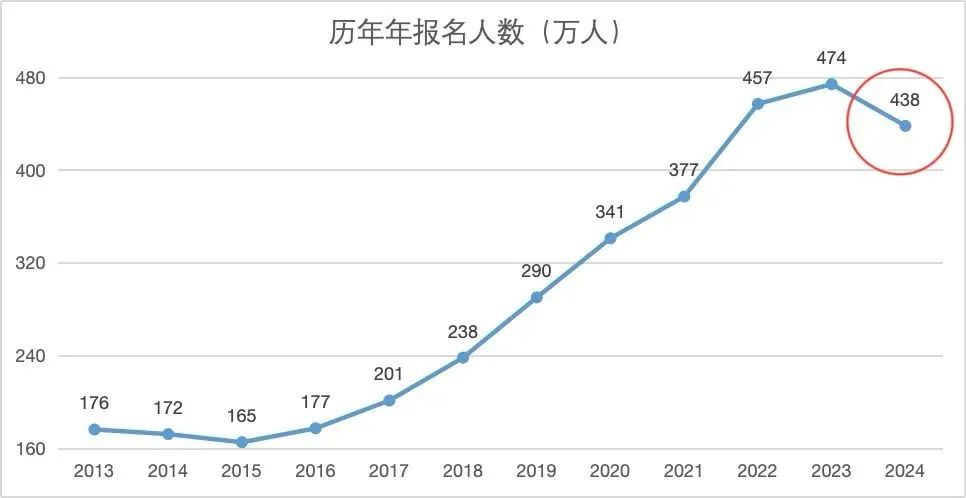 早在2016年,考研人數就進入了逐年攀升的高增長階段,直至去年才有所回落。此外,大量專業的報錄比、國家線、試題難度也在升高,製造出越來越焦慮、內卷的氛圍,考研甚至被調侃為“二次高考”。