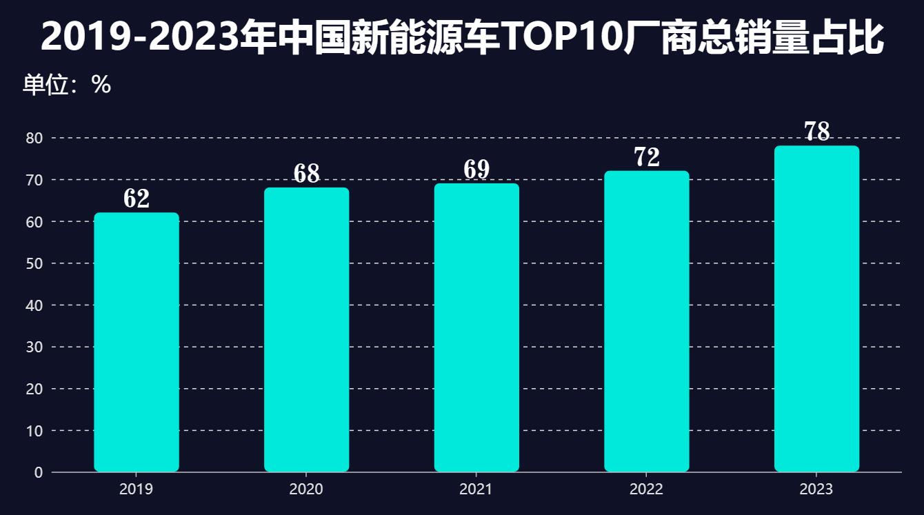 這就是第二點,行業的集中度在上升。我根據中汽協的數據做了個統計,發現銷量前10位的新能源車企,佔總銷量的比重越來越大,從2019年的62%,漲到了2023年的78%,相信今年能突破80%。