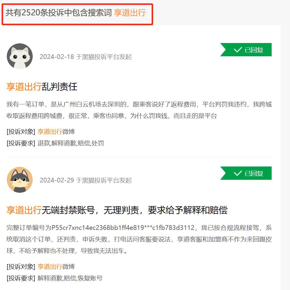 與此同時,享道出行還在多個媒體賬號上發出全國招募令,聲稱“多重優勢吸引司機入駐”,表示“司乘平等”,而另一邊,黑貓投訴平台上關於享道出行的投訴量卻已經突破了2500條,投訴理由多是平台判責不公、損害司機利益、無端封禁賬號、亂扣費等。