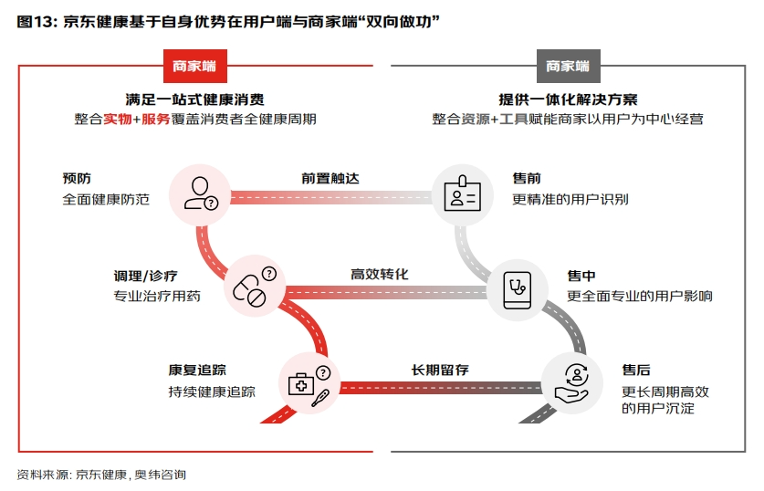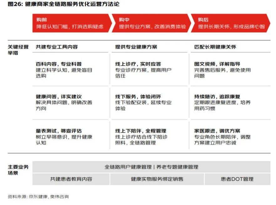 服務是健康消費區別於其他品類的最特殊一環,消費者在整個鏈路中缺乏可靠信息和個性化需求諮詢的途徑,這是痛點也是建立壁壘的最佳手段。京東健康用户購物動線全面升級,購前通過醫生科普和專業內容降低認知門檻,購中隨時通過人工或AI輔助的專業顧問打消疑慮,購後京東家醫提供體重管理私域、專屬營養管家、專業運動指導,全鏈路提升消費體驗。從業務流程中不斷優化服務內容的質量和供需匹配。