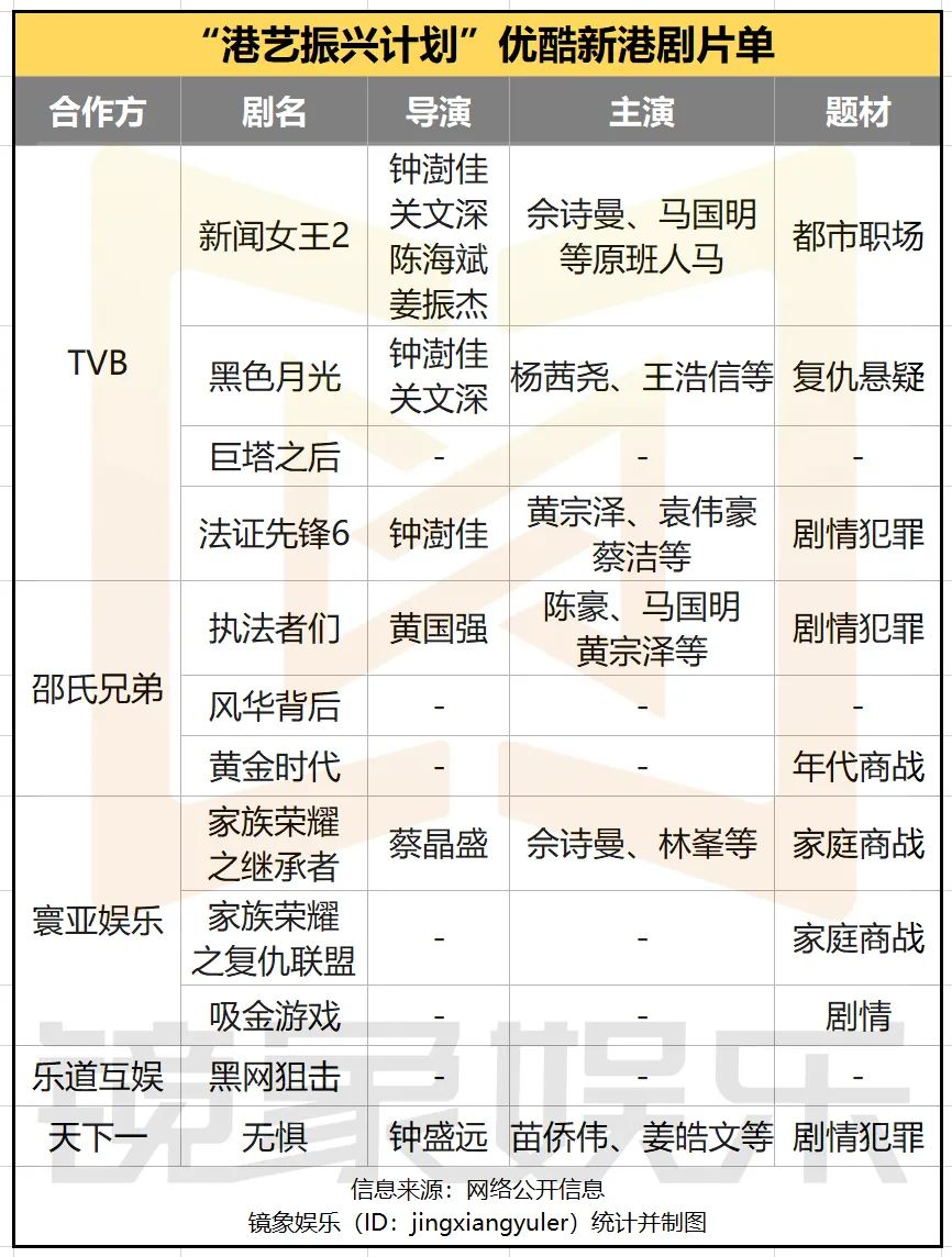 其中,《新聞女王2》官宣原班人馬迴歸,基於前作不俗的播出表現,優酷與TVB還計劃把《新聞女王》拍攝成為大IP的系列劇集。此外,《新聞女王》團隊還將為TVB視後楊茜堯量身打造迴歸之作《黑色月光》;寰亞娛樂佈局的《家族榮耀》新作也頗受注目。