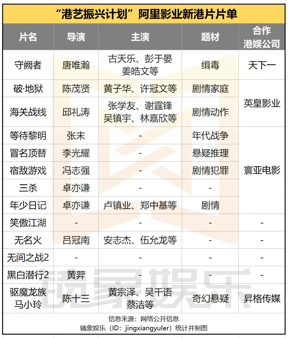 同樣,阿里影業與港娛也早有淵源。在此次“港藝振興計劃”啓動之前,阿里影業便攜手香港電影出品方,推出《拆彈專家2》《毒舌律師》《潛行》等20多部港片。未來,阿里影業還將在新港片方面繼續落子,古天樂攜手彭于晏的《守闕者》,張學友、謝霆鋒等主演的《海關戰線》等都出現在此次的片單中。