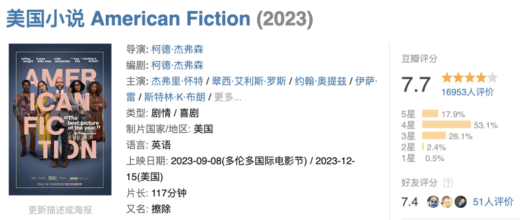 《美國小説》的精英黑人男主沒有生存危機,他搞砸了身邊所有人的關係,這些勞動一直是妹妹在維繫,後來妹妹患病去世,而他最大的危機是創作焦慮,和參加一個文學頒獎禮。