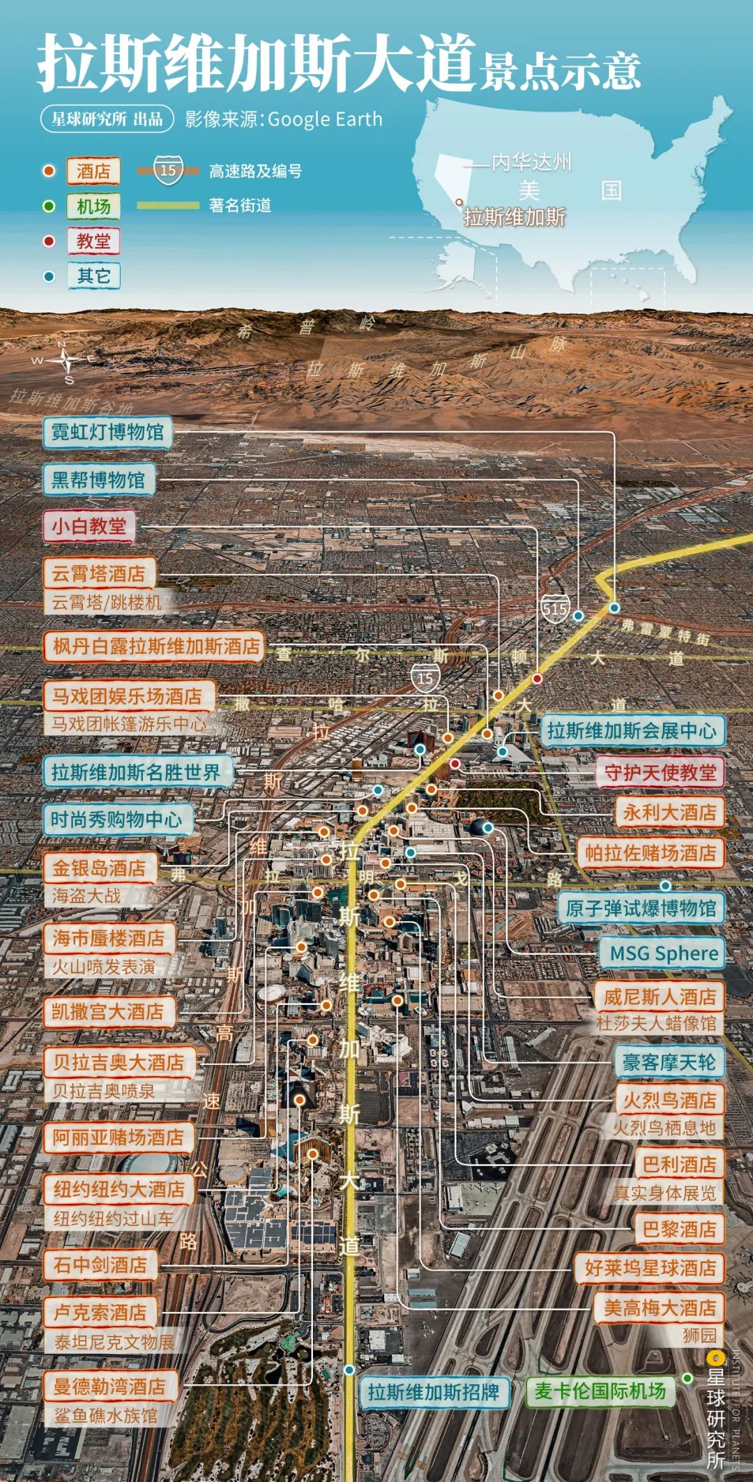 (以上數據均指“拉斯維加斯都會區”,其面積稍大於北京;下圖是“拉斯維加斯大道”景點示意,這條約6.8千米長的大道佈滿酒店,是拉斯維加斯的“靈魂”所在,製圖@高儷倩/星球研究所)