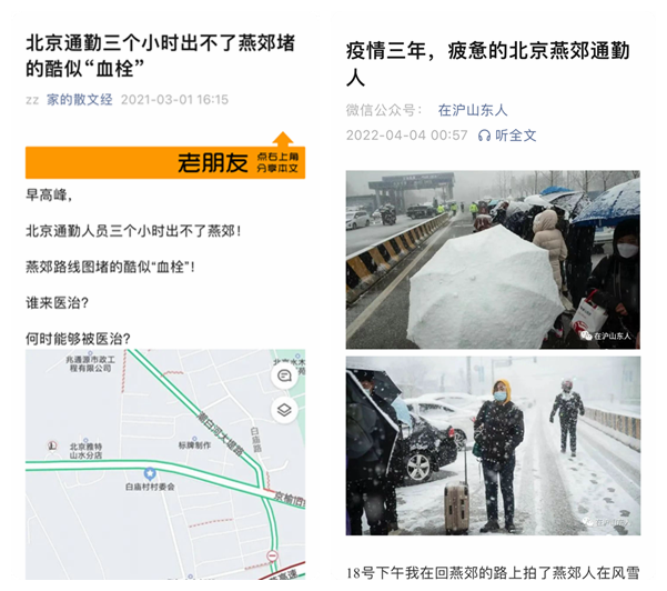 或者,就是作為渲染“北漂”艱苦生活的絕佳素材。燕郊到北京的通勤,雖直達,但擁擠且漫長,過程堪稱痛苦,不僅動輒單程兩個多小時起步不説,排隊等待檢查站更是一段充滿煎熬的歷程。