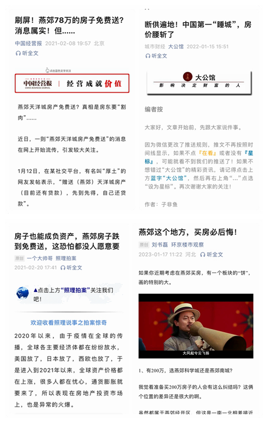 其中被説得最多的就是“燕郊房價腰斬,房主後悔得要死,願意免費送房”等內容,並被各大自媒體作為最典型的反面教材來勸導大家謹慎買房。
