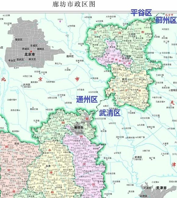 整個廊坊市地界,被北京市通州區和天津市武清區“攔腰截斷”,形成了一個地級市區域分為不相連接兩塊的格局。