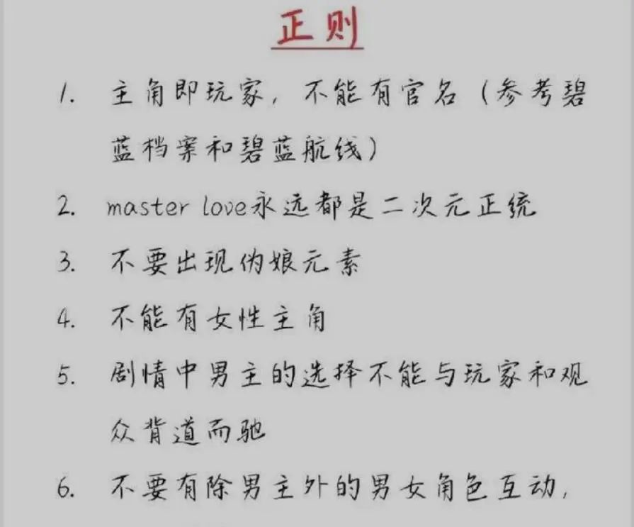 相比於最初對ML的定義,如今的ML黨給自己加入了更多條款:比如所有女性角色都必須只對玩家抱有好感;遊戲內不得出現其他男性角色(尤其是可抽取角色);甚至女性角色之間抱有好感(百合)也不被允許……