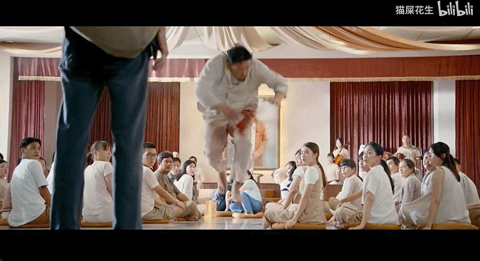 看多了陳桂林“biabiabia”,創作者們又將目光轉向了尊者兩口子,甚至連被擊中腿部地面滑行的小胖也沒逃過。同樣在觀眾討論中頗具熱度的洗禮片段,也成為“血洗禮堂”之後的又一熱門創作素材。原片中,尊者身為通緝榜“榜一大哥”一度成功把陳桂林忽悠瘸了,創作者便藉此嘲諷職場PUA、營銷忽悠等社會現象,演技不比阮經天卻能輕鬆引起網友共鳴。