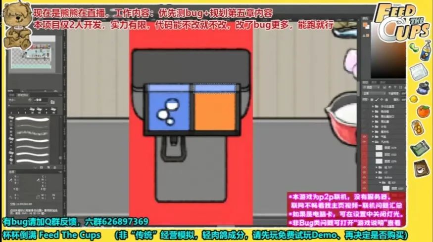 當我們撰稿時,遊戲的開發者之一熊熊也正在B站進行直播。最近越來越多的獨立遊戲開發者會使用直播改代碼來推廣自己的作品,但不同的是,在熊熊的直播間裏最醒目的一行字寫的是:“實力有限,代碼能不改就不改,改了BUG更多,能跑就行。”