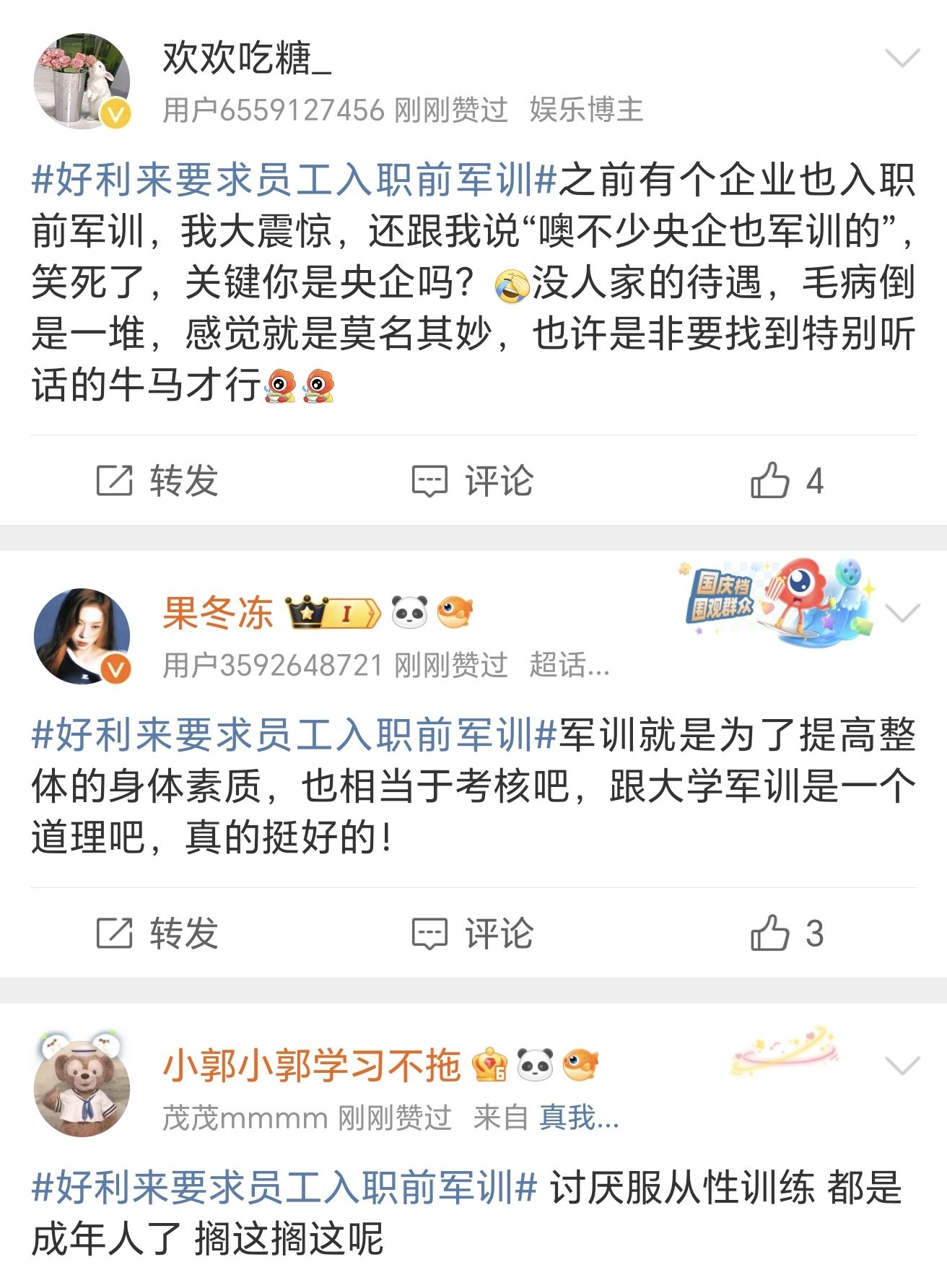 現如今的許多網友也對好利來的這種入職前先軍訓的作法有意見,認為大家都是出來打工的,還搞什麼服從性訓練,真的有點不大合適。