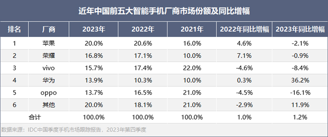 這幾年手機市場大環境並不景氣,大多數品牌都有下滑的趨勢,就算強如蘋果也避免不了。2022年還能勉強保持正增長的蘋果,到了2023年也只能接受負增長的命運。在整體下行的市場環境中,華為卻逆勢大幅增長,36.2%的增長率令人咋舌,成為蘋果強勁的對手。