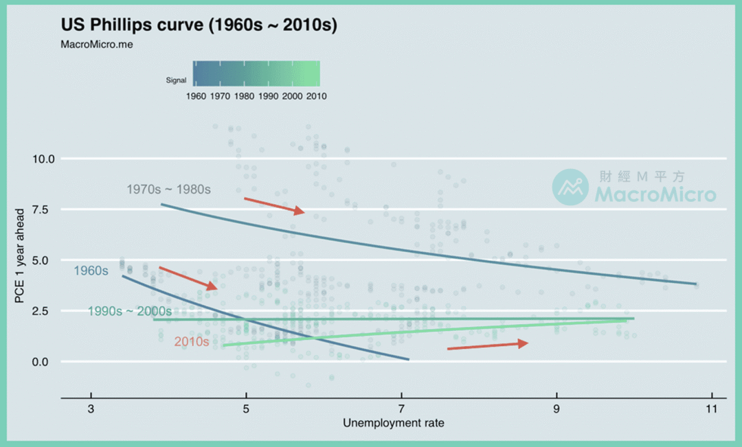 直到08年金融危機後,經濟學家才反應過來,過去幾十年菲利普斯曲線越來越平坦,就業/增長和通脹的正相關關係越來越弱,10年代它甚至反了過來,通脹越高失業反而越高,央行再怎麼放水嗑藥,也扭轉不了失業上漲、經濟停滯甚至衰退的趨勢了。