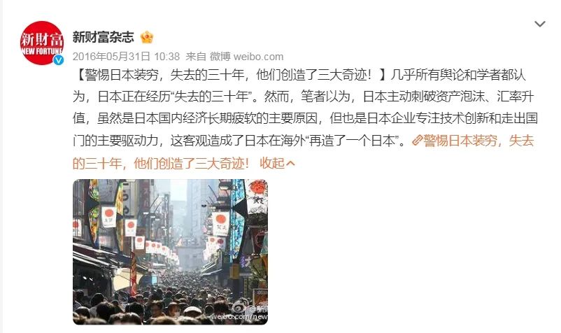 可放在今天,這個國家變成了日本,財經界和輿論界卻畫風一轉,大肆吹捧日本“終於擺脱了通縮”、“經濟復興在即”、“走出了失去的三十年”,甚至一種全新吹法正在興起:失去的三十年其實不存在,明明是日本在斂藏實力,你國人還真以為日本不行了。