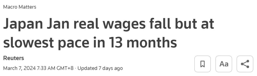 從14年起,日本實際工資(工資漲幅-物價漲幅)一直跌跌不休,但只要想起日經氣勢如虹的上漲,想必日本打工人也會驕傲地挺起胸膛。有人指望今年春鬥(每年春天工會與公司的漲薪談判)扭轉實際工資下跌的趨勢,可在通脹保2%的宏偉目標面前,還是再苦一苦日本打工人吧。