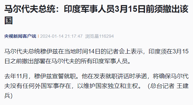 3月14日,穆伊茲政府重申,印度須在3月15日之前撤出部署在馬爾代夫的所有印度軍事人員,馬爾代夫是一個主權國家,不是任何國家的後院,中國始終尊重馬爾代夫的主權完整。而這意思就很明確了,有了中國“打狗棒”在手,印度憑什麼再來齜牙咧嘴?