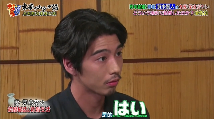 在這期間賀來賢人也一直堅定地給足老婆榮倉奈奈安全感,在節目中被問到老婆榮倉奈奈是不是他最喜歡的人的時候,也不假思索地回答,是全世界最喜歡的。