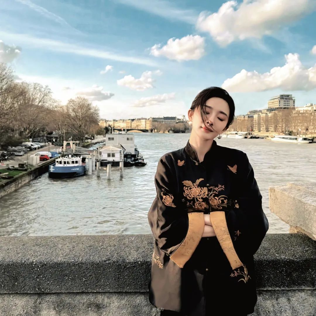 這段時間亮相巴黎,她又穿着立領盤紋的新中式在塞納河邊拍照打卡,浪漫復古與法式風情結合得剛剛好。