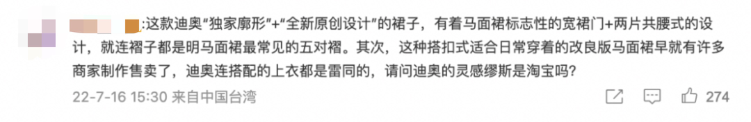 2022年,網友發現迪奧官網的一件售價高達29000的半身裙直接照搬了中國傳統服飾馬面裙,官網簡介裏還大言不慚地寫着:“採用標誌性的Dior廓形,是一款全新的優雅時尚單品。”