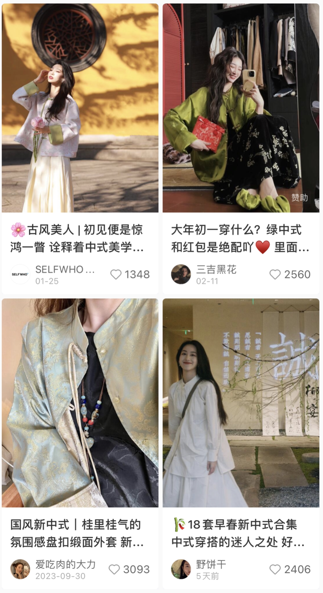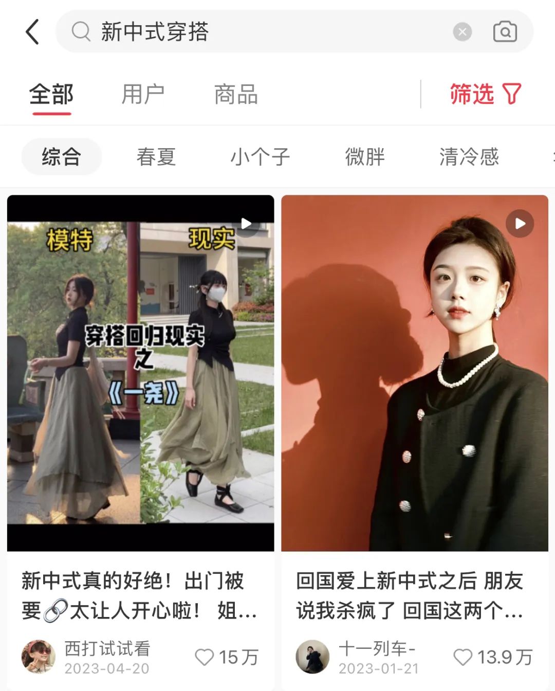 在社交平台,#新中式 詞條有26.5億瀏覽;具體到“新中式穿搭”,熱度最高的一篇筆記有15萬點贊。
