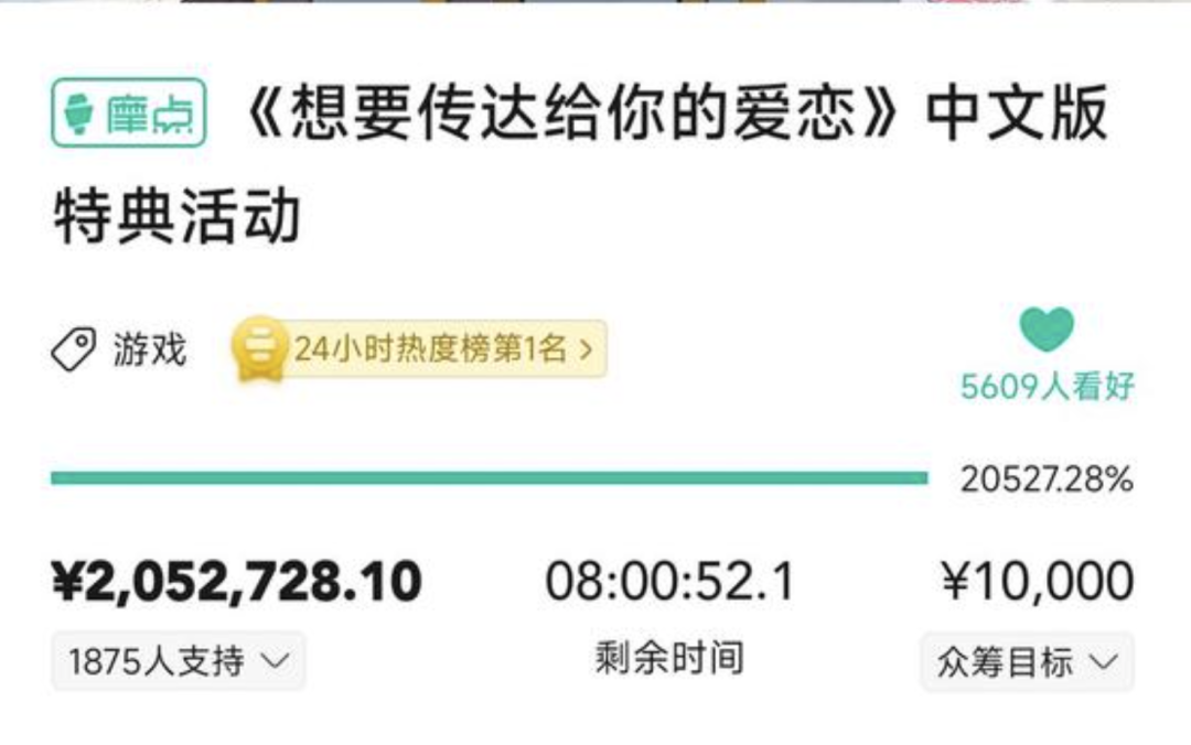 這一點放在核心黃油玩家羣體裏或許會更好理解,去年十月,黃油名作《想要傳達給你的愛戀》摩點眾籌突破200萬元人民幣,近兩千名富哥用愛發電,硬生生砸出了4000多萬日元的眾籌金額。