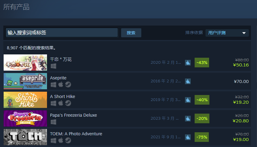 但無論如何,Steam 94%的好評率在這擺着,事實證明大部分玩家壓根就沒考慮過那些個優缺點。雖説Steam的官方算法不太靠譜,但打開排行榜,在Steam總計8907款熱銷遊戲裏,好評率第一的遊戲正是我們的主角《千戀萬花》。