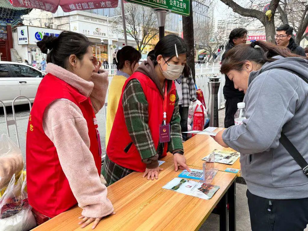 天水市秦州區的街道一側,志願者為外地遊客答疑解惑。(圖:新華社 文靜)