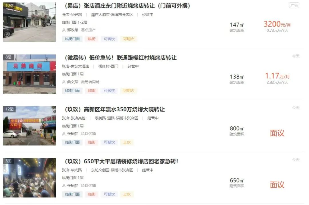 去年7月,《中國新聞週刊》的記者也在58同城網站上看到,淄博有數百條燒烤店鋪正掛牌轉讓。其中也有不少都是剛開業不久,裝修和設備都很新穎的新店鋪。