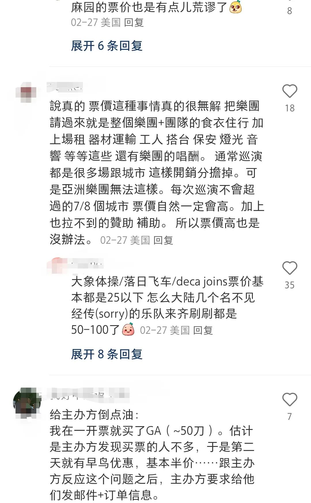 位於紐約的留學生Olivia 表示,“比如麻園詩人、房東的貓,基本上是60多美元起,VIP最高超過110美元”,但“其實在美國看Livehouse很便宜,Coldplay、事後煙等都不過50多美元,METALLICA這樣的也僅僅是100美元左右,包括前兩年大象體操、落日飛車也是20-30多美元。但去年下半年開始,很明顯華語地區這邊過來的音樂人很少有低於30美元以下的”。