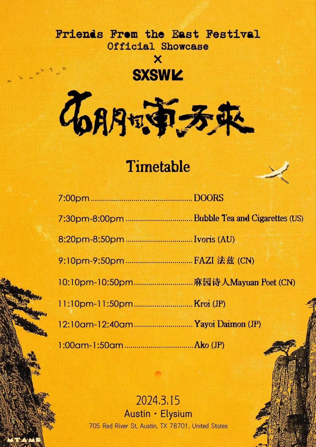 在前兩日剛剛結束的美國SXSW(西南偏南)音樂節“Taiwan Beats Showcase”演出上,MongTong、恐龍的皮、Gummy B等來自於台灣地區的音樂人率先結束專場演出;而在3月16日(美國時間3月15日),麻園詩人、法茲樂隊與其他亞洲音樂人所參演的SXSW音樂節“Friends From The East Showcase”也於圓滿落幕。