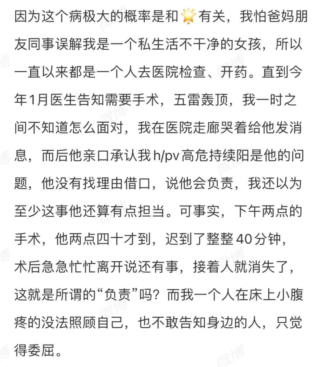稱自己在戀愛期間被對方感染了高危HPV,目前已經入院治療,還需要進行手術。