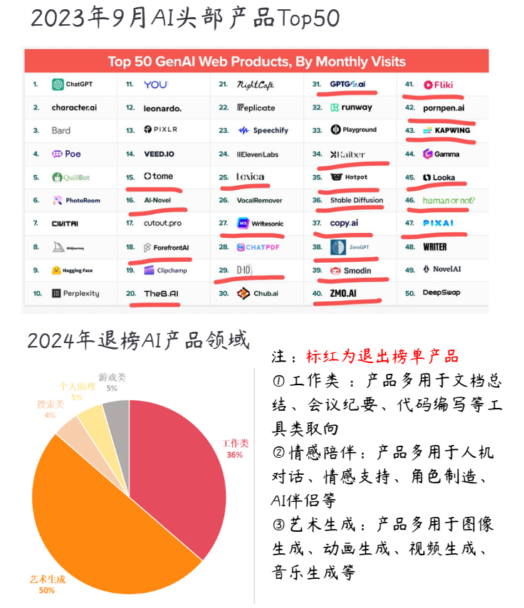 1.過去半年,AI應用進行了一輪大洗牌。與去年9月的榜單相比,最新的Top50 AI應用裏出現了22個“新面孔“,也意味着有22個AI產品掉隊了。