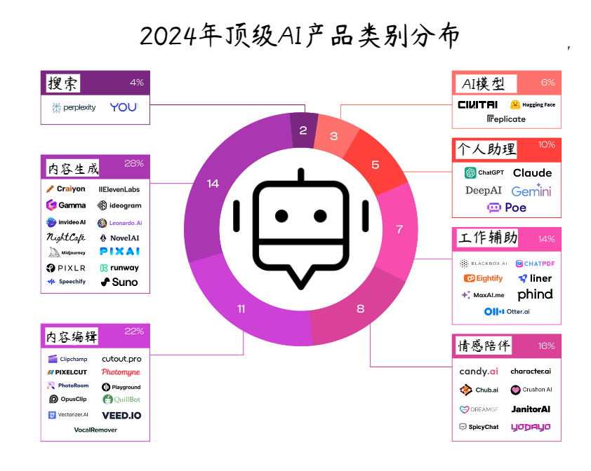從AI應用產品類別分佈看,與ChatGPT、Gemini類似的通用性AI產品的風頭大降,相反垂直性、專業性更強的AI應用開始崛起。在a16z最新的訪問量Top50 AI應用榜單裏,內容編輯、內容生產、情感陪伴等AI產品佔比將近70%,個人助手類產品在榜單僅佔10%,比起半年前佔比降低60%。