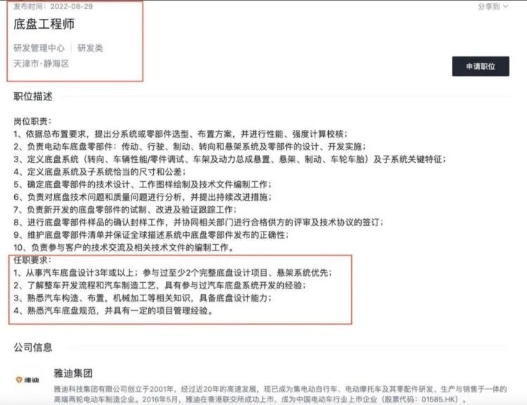 從網傳的圖片看,雅迪的相關工作人員確實在對車輛進行認真拆解,而從被曝出的雅迪招聘信息看,雅迪確實有過對底盤工程師、資深產品經理(智能駕艙)、汽車電子儀表工程師等相關崗位招聘。從招聘要求來看,均要求有一定行業經驗,其中對汽車電子儀表工程師的要求有分解造車配件表、評估儀表功能和整車配置是否合理等工作要求。