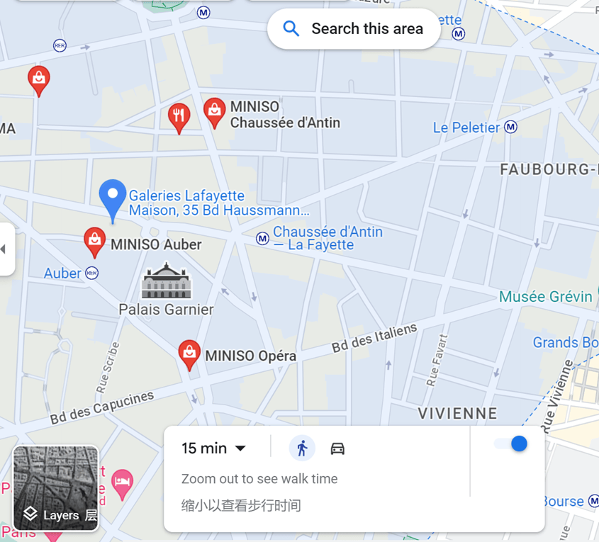 在法國巴黎老佛爺百貨周邊的15分鐘步行圈內,也有3家名創優品門店。